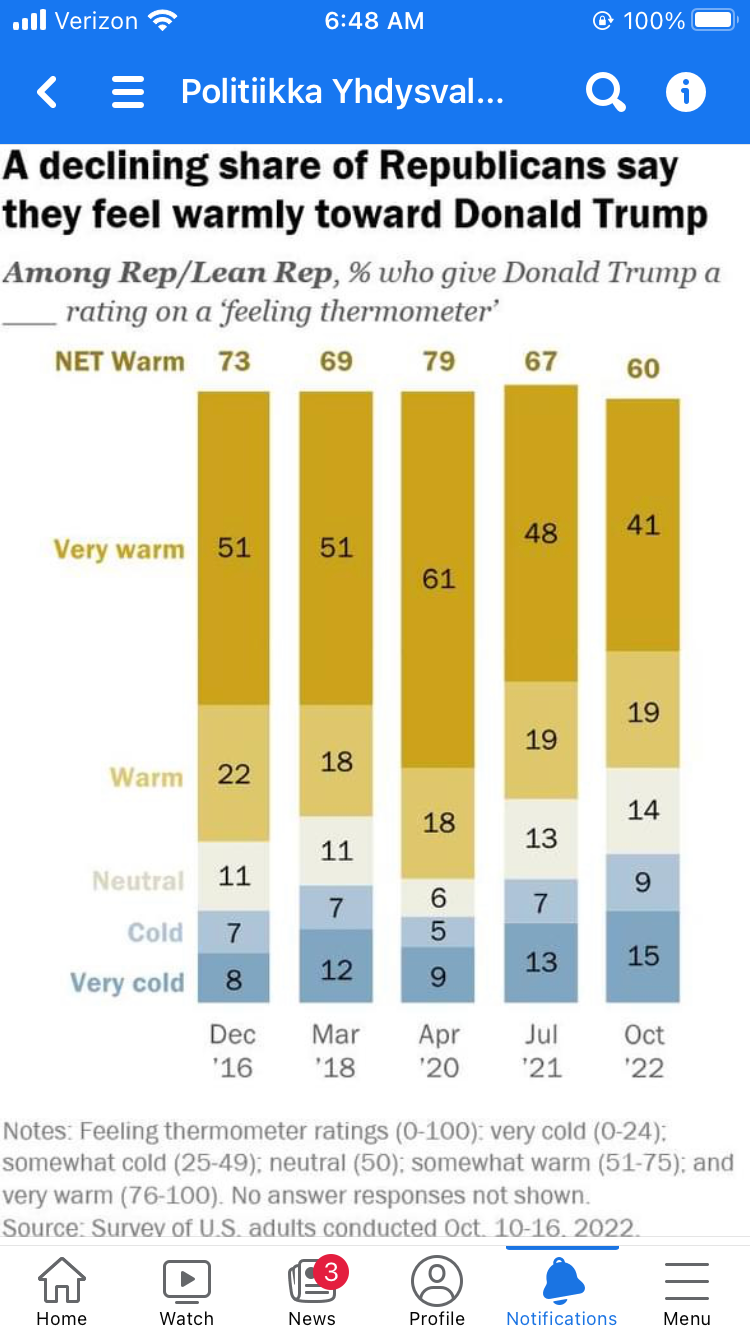 https://www.politico.com/news/magazine/ ... r-00069163It’s tempting, then, to see Trump, not DeSantis, this time around as more of the Jeb Bush — a has-been who’s done but doesn’t know it or doesn’t want to admit it. “He’s dead man walking,” longtime Florida-based, mostly Democratic megadonor John Morgan told me. “He’s lost three elections in a row,” Sam Nunberg, one of Trump’s earliest political advisers before and during his 2016 campaign, told me. “The majority of the country despises Trump,” Nunberg noted, “and the majority of the Republican Party is moving on.” It’s far from only Murdoch’s Post and Fox News and the Wall Street Journal that are blaming Trump for the spate of GOP losses and blaring a shift in preference. Previously supportive elected officials from the Senate to the House and down to the states have begun to edge away as well. Perhaps equally importantly, right-of-center talkers, bloggers and influencers like Mike Cernovich and Candace Owens have openly criticized a man they once lionized. Some of the most up-to-date polling is showing more Republican voters want DeSantis more than Trump.