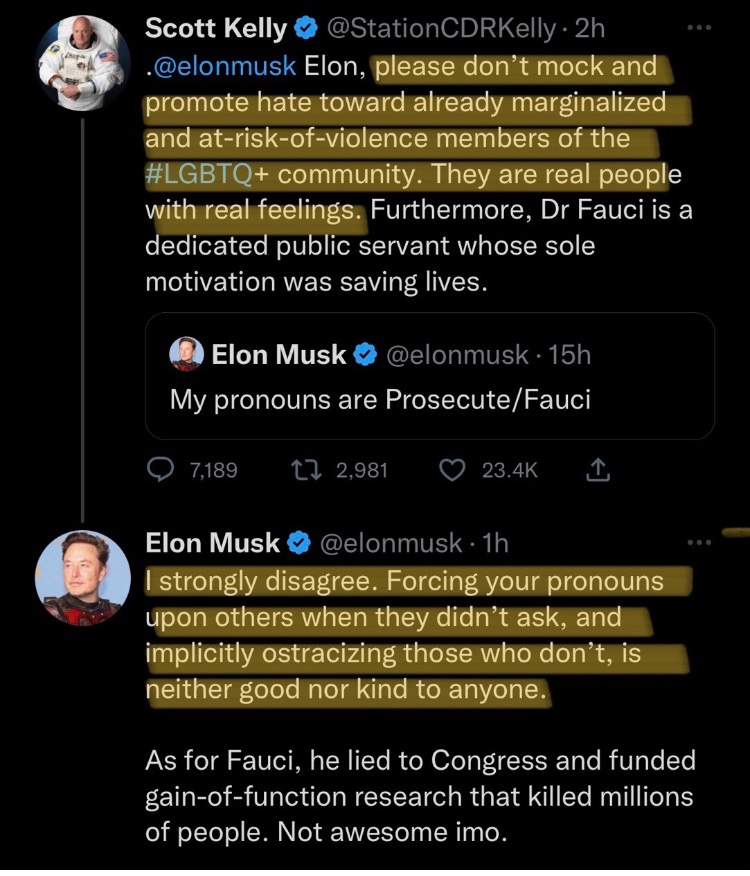 “My pronouns are Prosecute/Fauci,” Musk said on Twitter. He later shared a meme edited to show Fauci telling Biden, “Just one more lockdown, my king.”