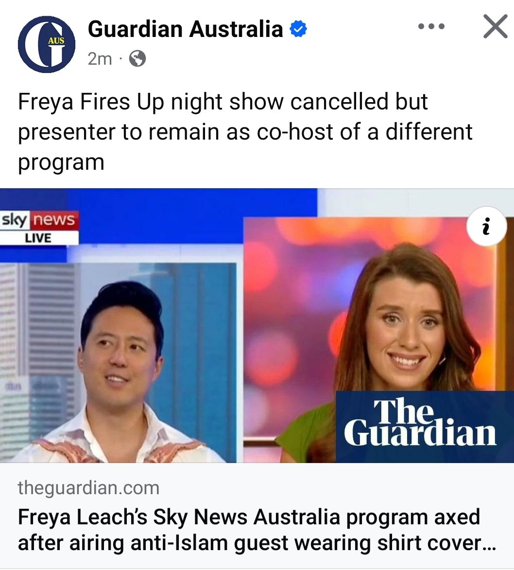 The difference between the US and Australia. Sky "News", Murdoch media that loves to import American culture war crap, cancels show after guest wore a shirt with bacon on it to shield himself from Muslims. Contrast with Fox "News" in the US where a presenter can call for the mass extermination of the homeless and face no sanction. I'm glad we are still holding out.