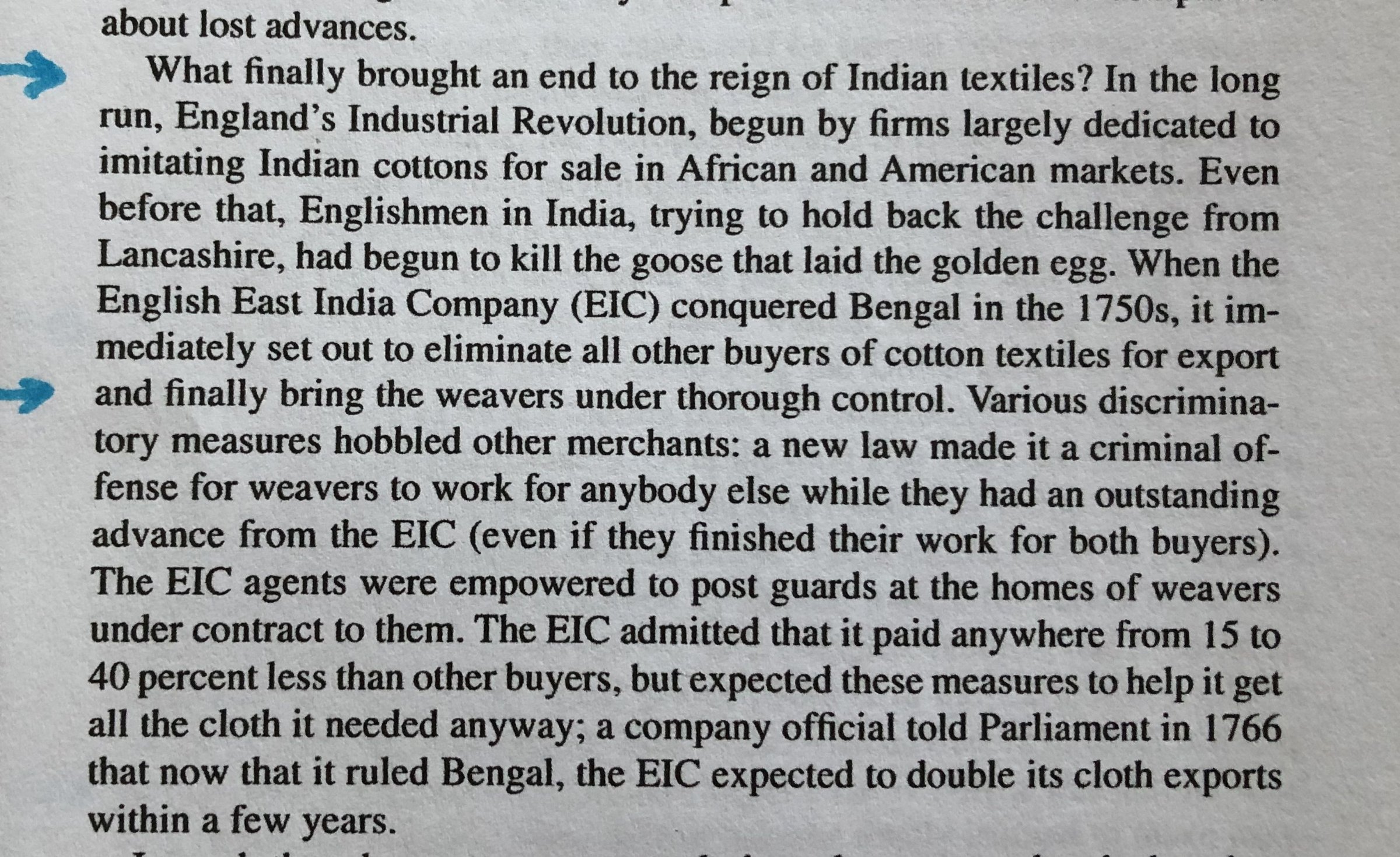was the killing of the golden goose when the english forbade manufacture of cloth in india, as they so destroyed a major source of trade material? Sorry if my comment is kind of anachronic, I'm not sure of the timeline of british colonisation in india.